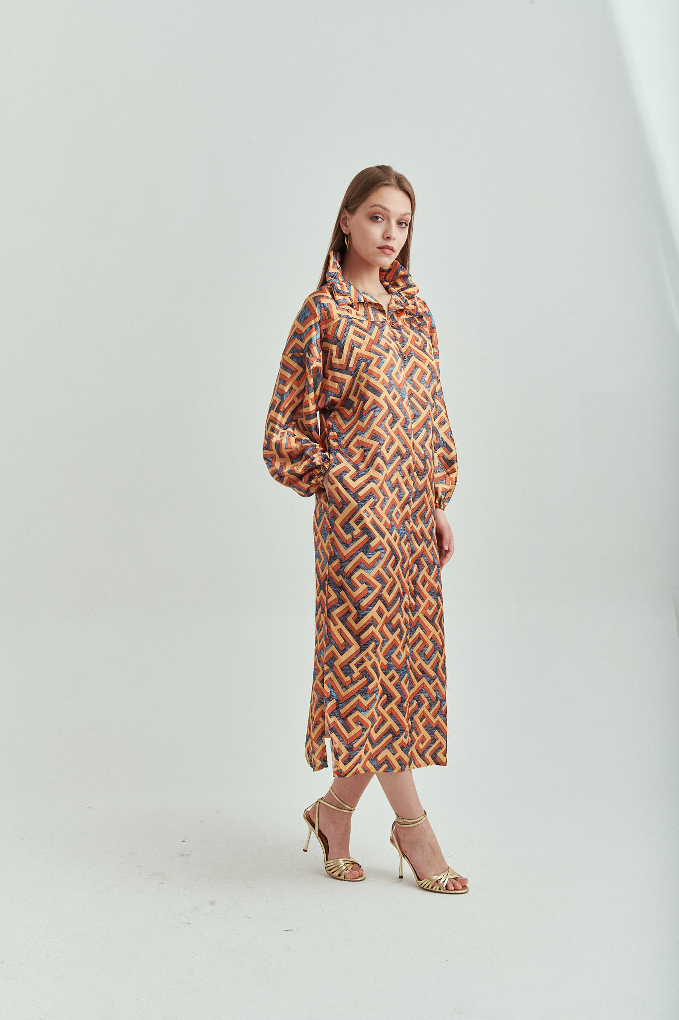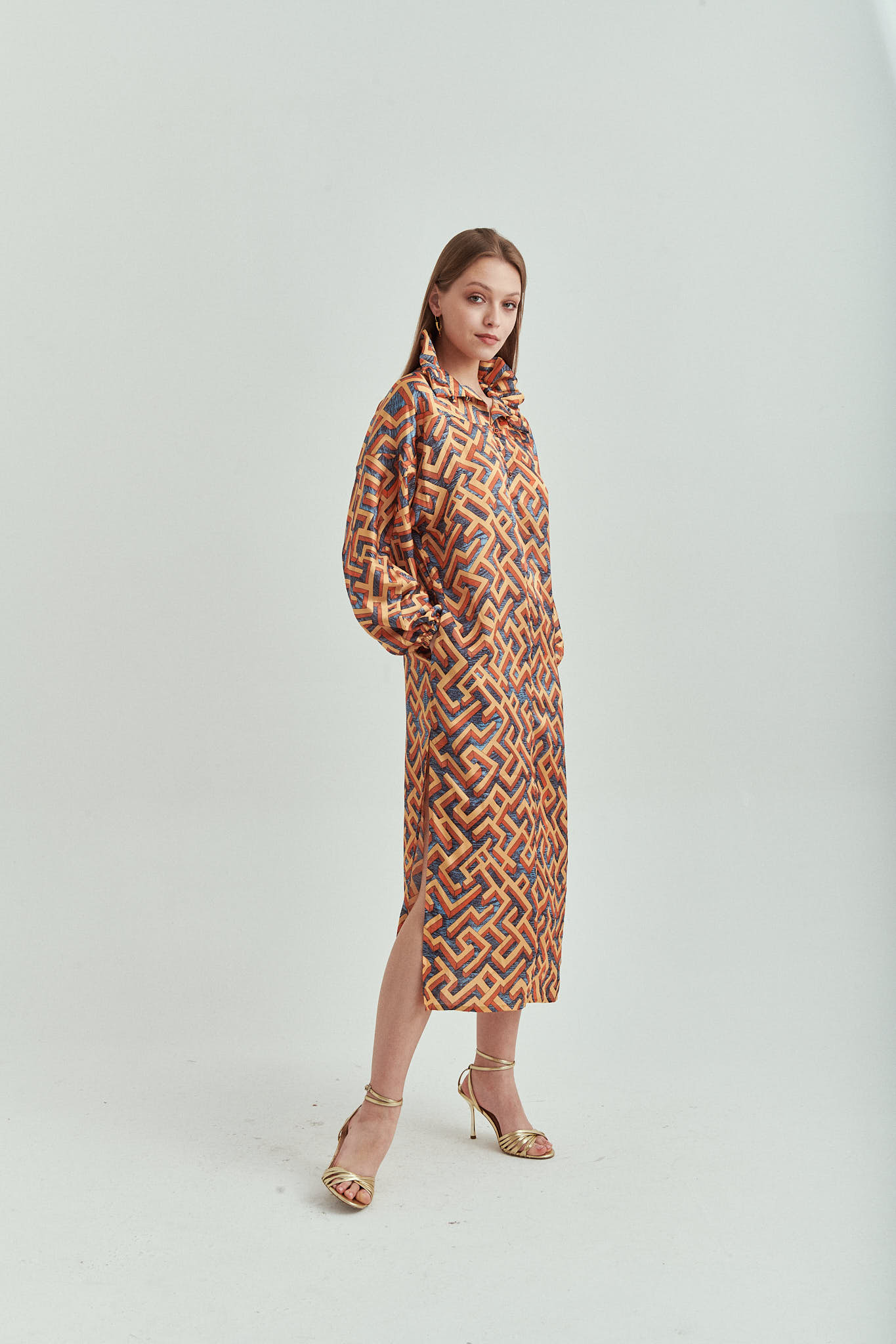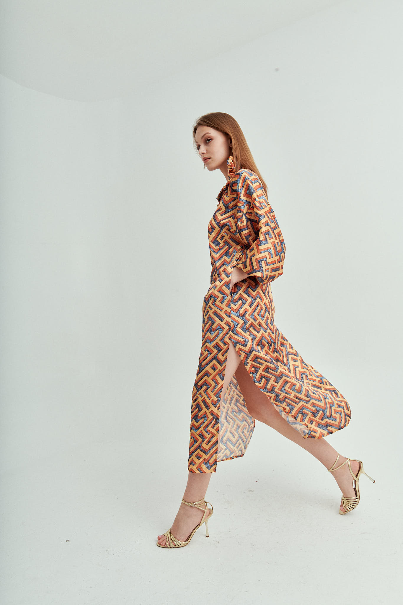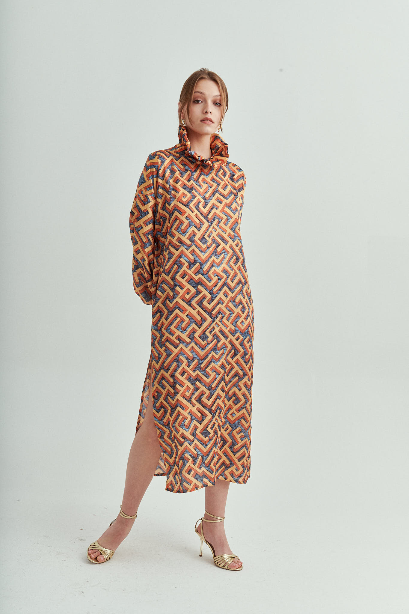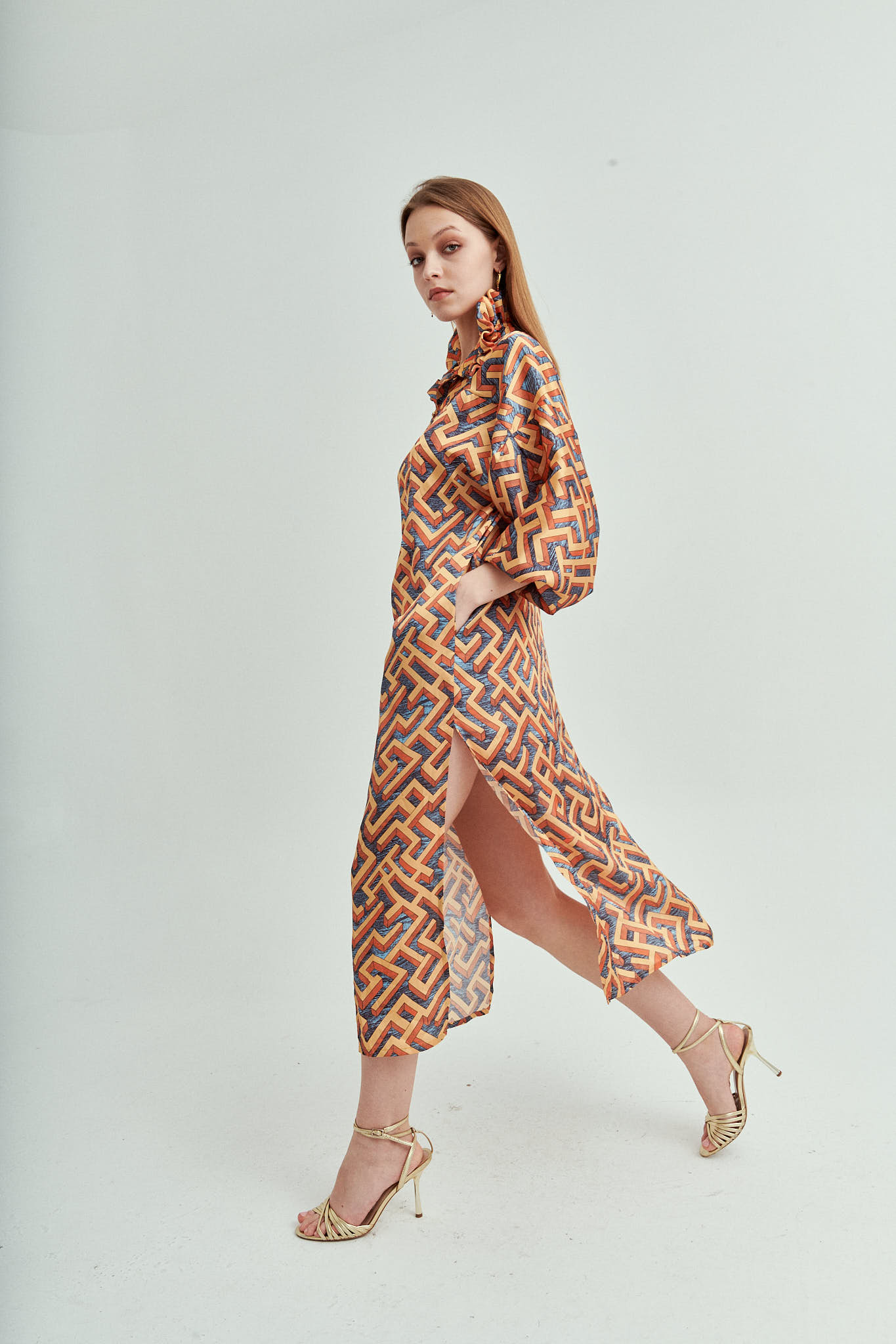 The Iris dress has two completely different look can be worn flipped front to back depending on the event/purpose or mood. One side with a high neck ruffle collar and the other side button down neck with 3 gorgeous gold plated jewel buttons. Both side with thigh high slits and balloon elasticated long sleeves finishes the look.