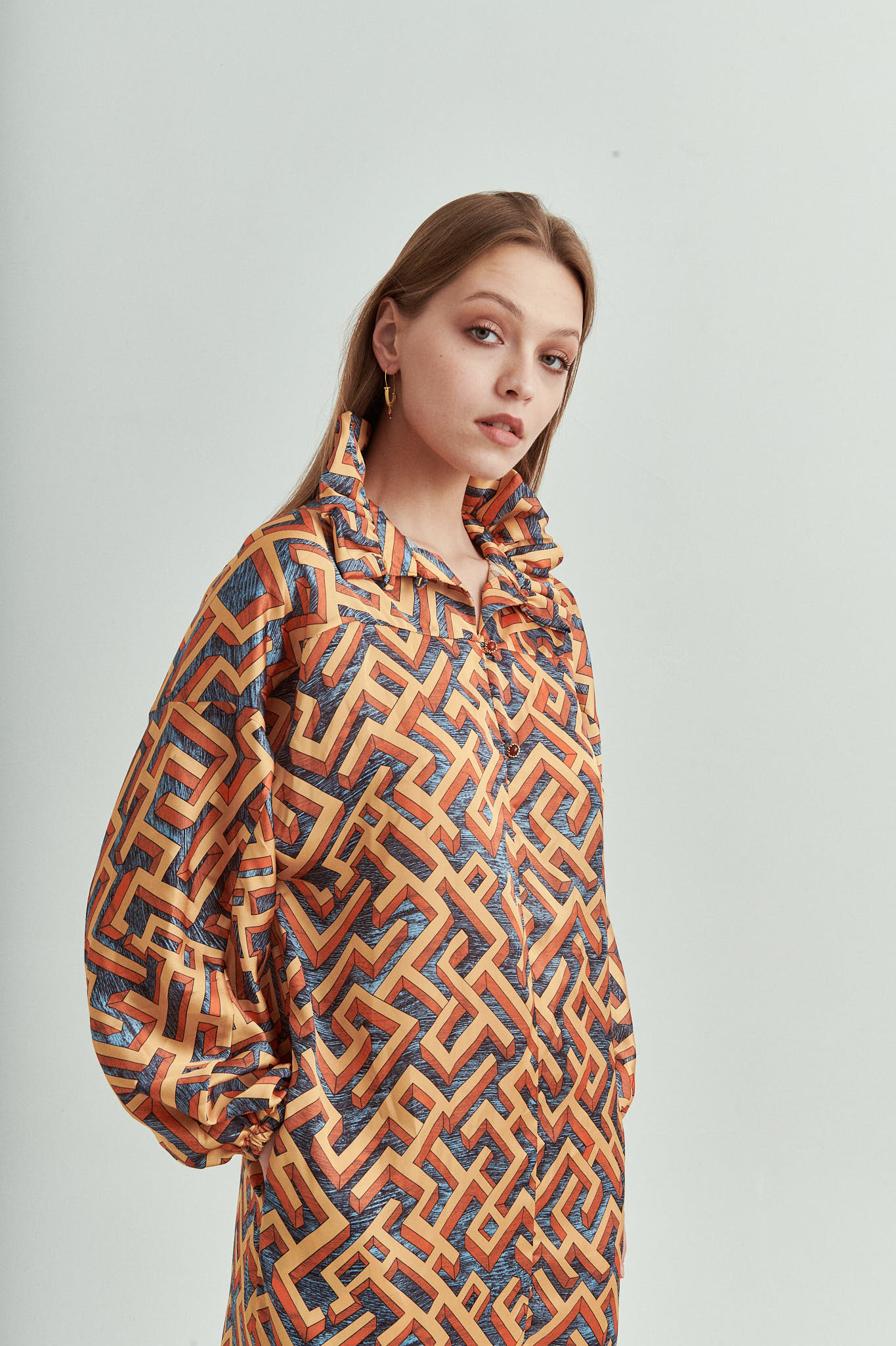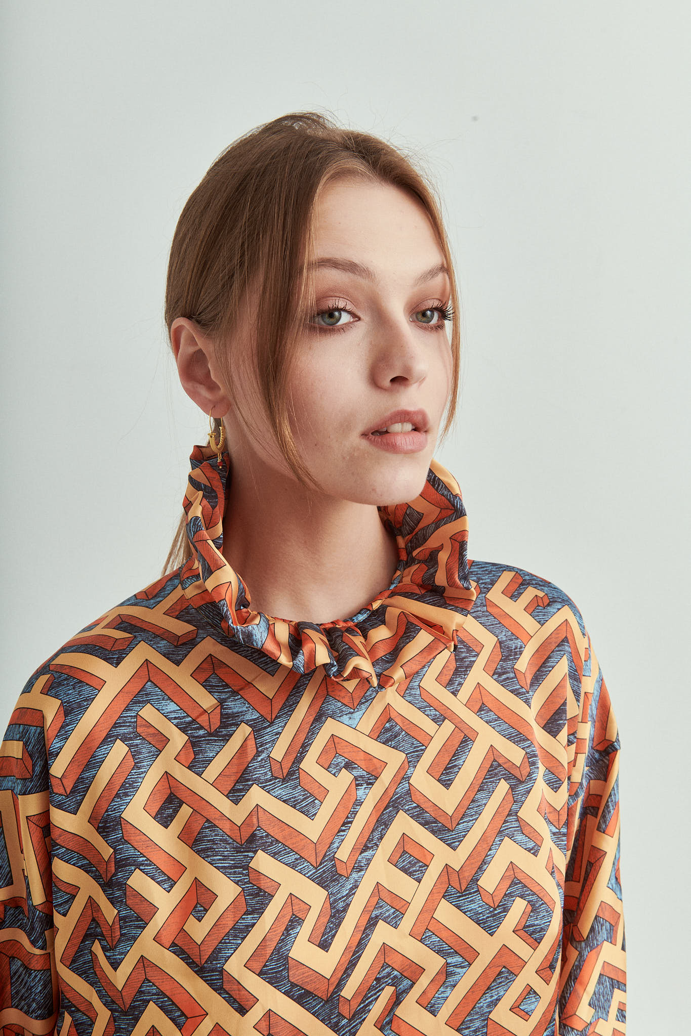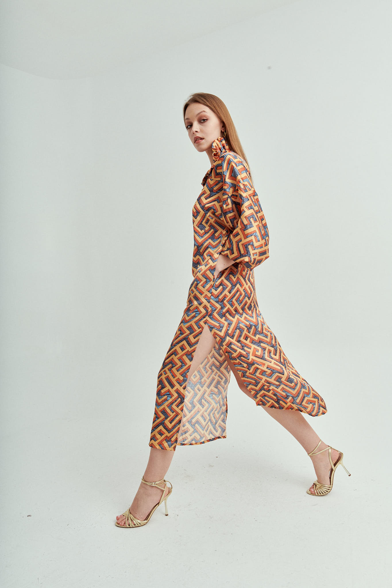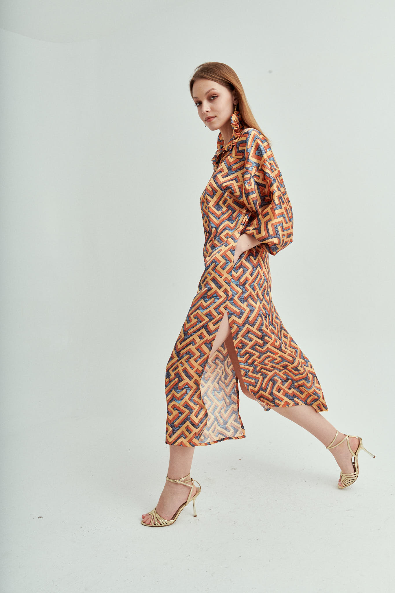 The Iris dress has two completely different look can be worn flipped front to back depending on the event/purpose or mood. One side with a high neck ruffle collar and the other side button down neck with 3 gorgeous gold plated jewel buttons. Both side with thigh high slits and balloon elasticated long sleeves finishes the look.