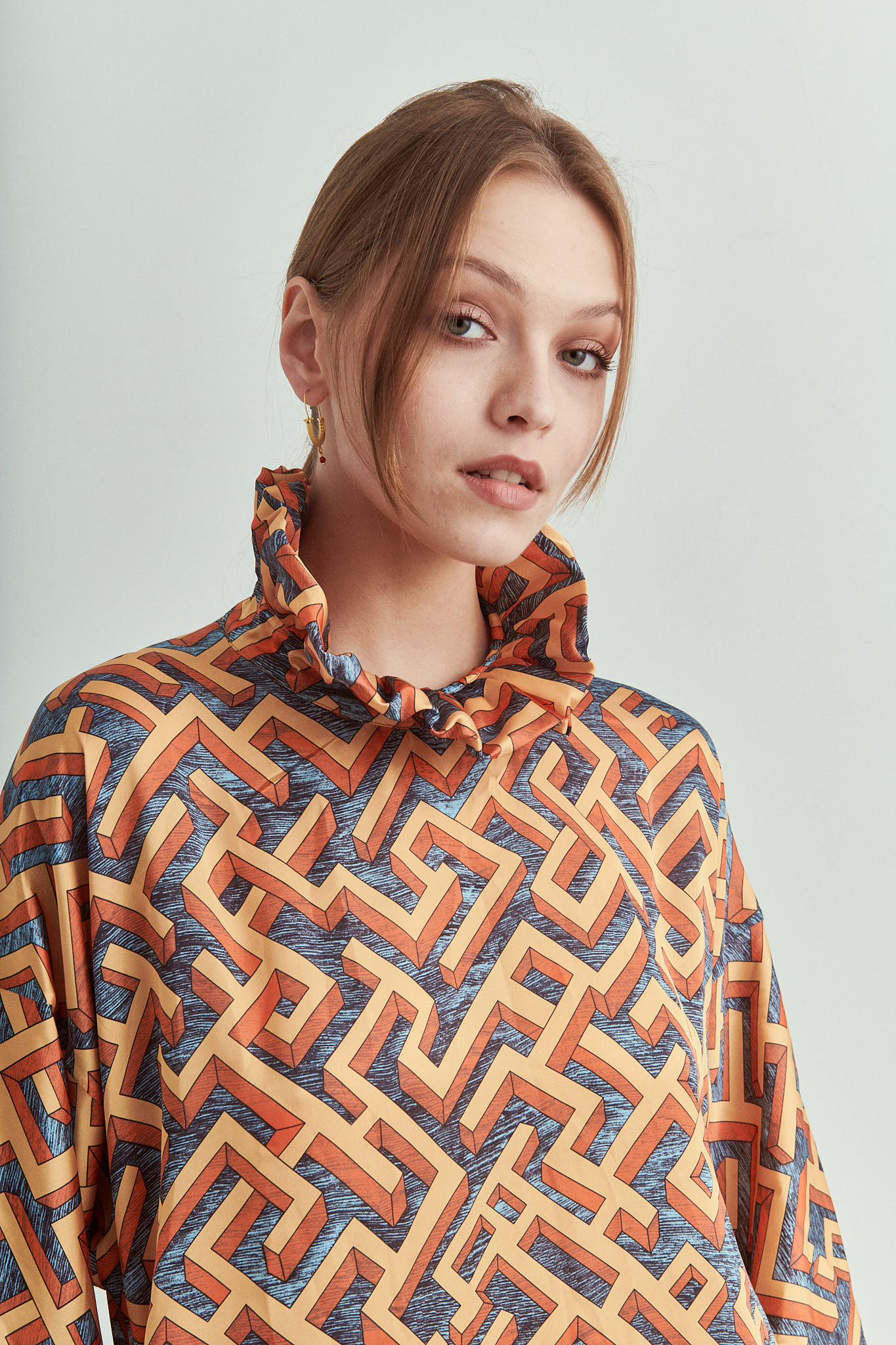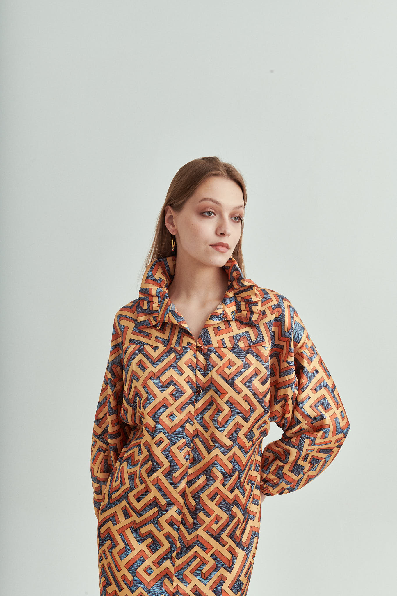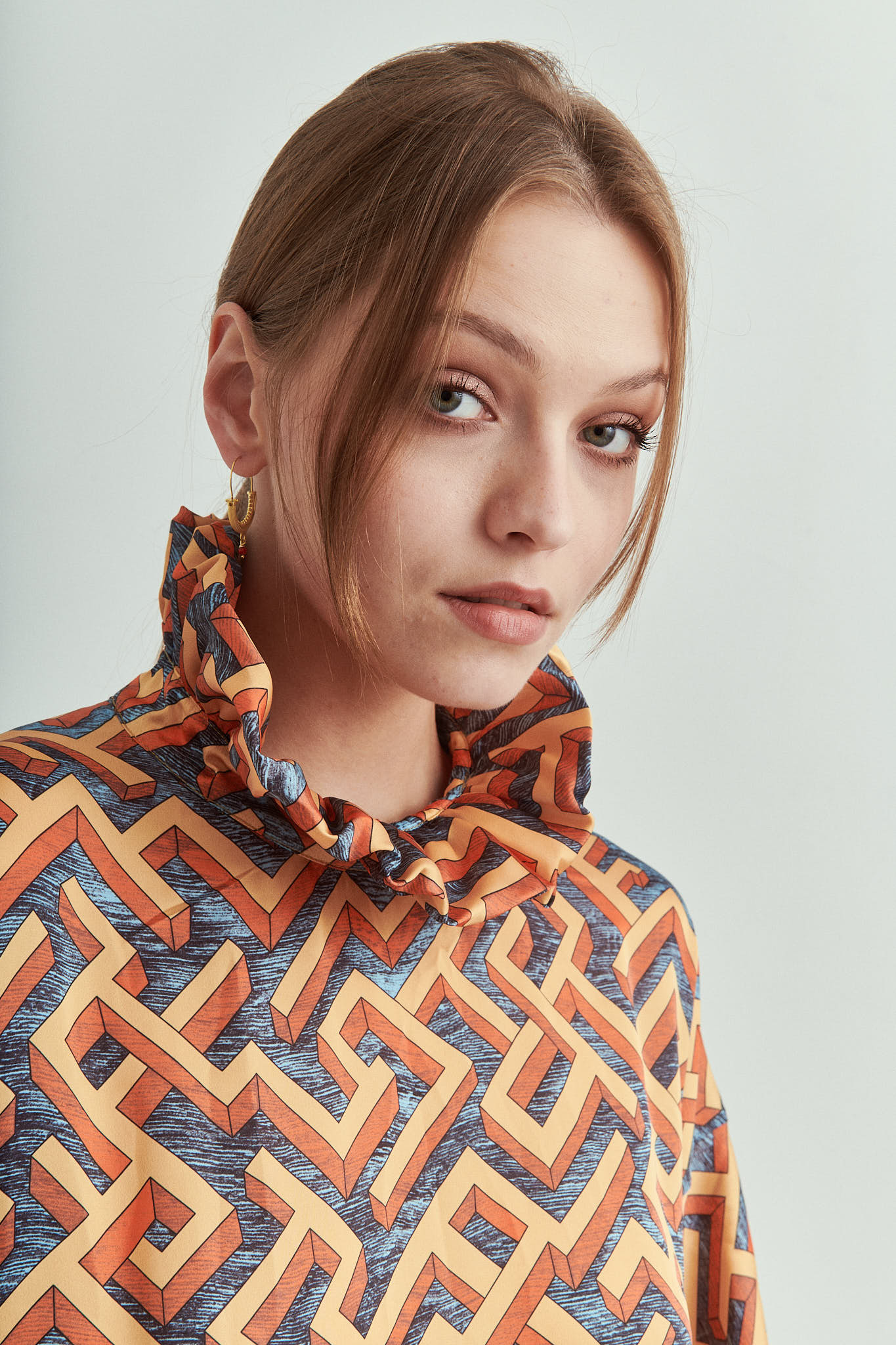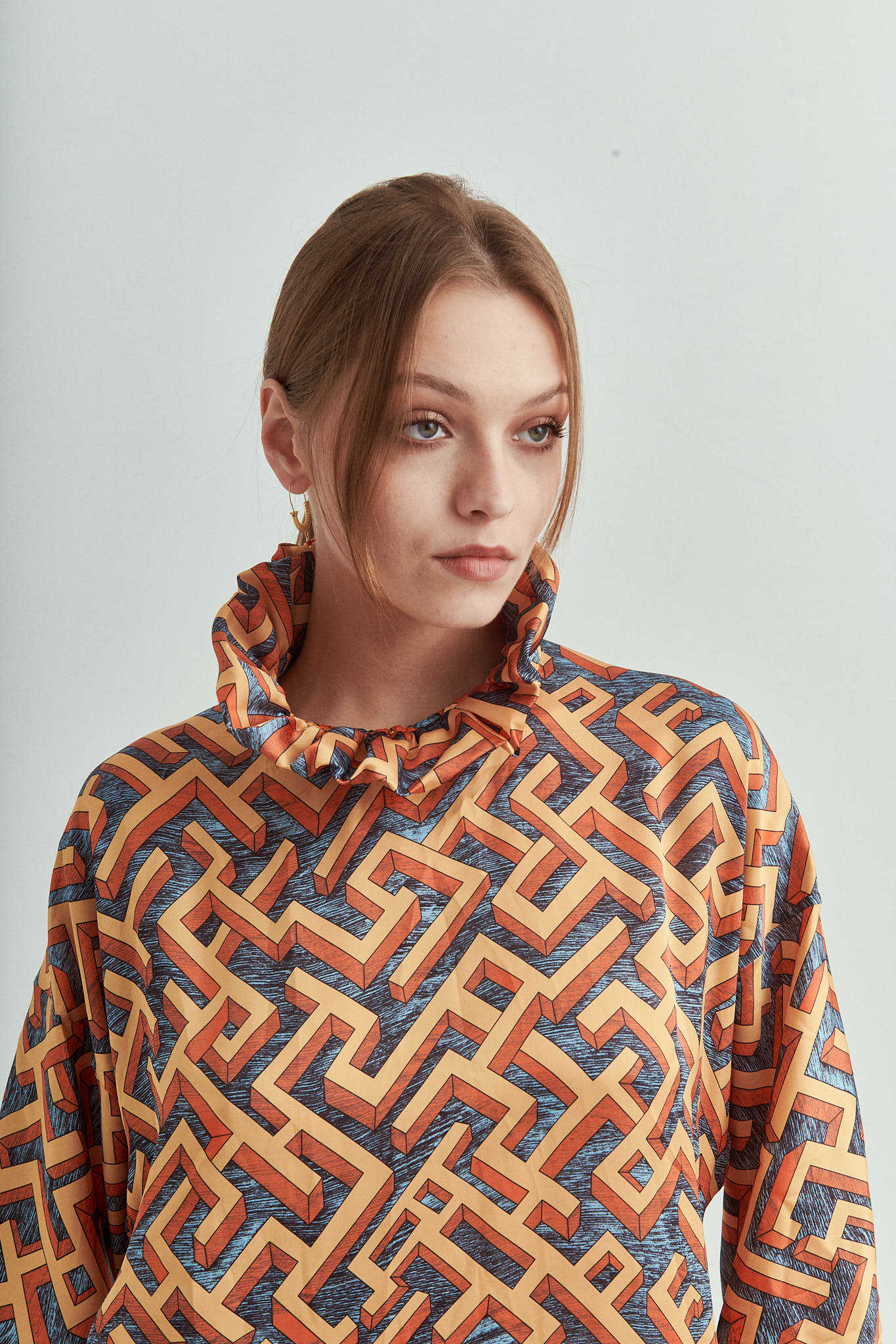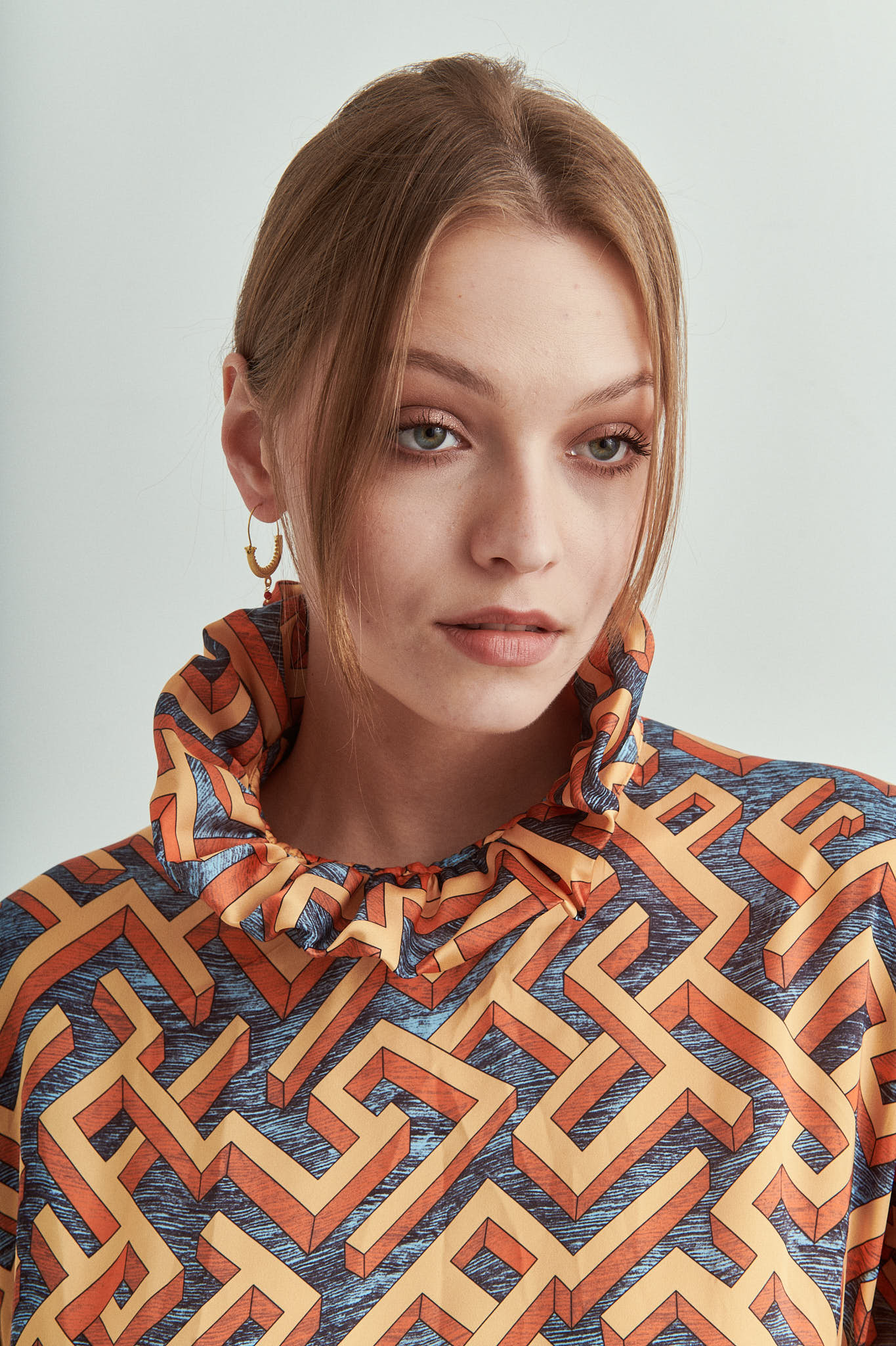 The Iris dress has two completely different look can be worn flipped front to back depending on the event/purpose or mood. One side with a high neck ruffle collar and the other side button down neck with 3 gorgeous gold plated jewel buttons. Both side with thigh high slits and balloon elasticated long sleeves finishes the look.