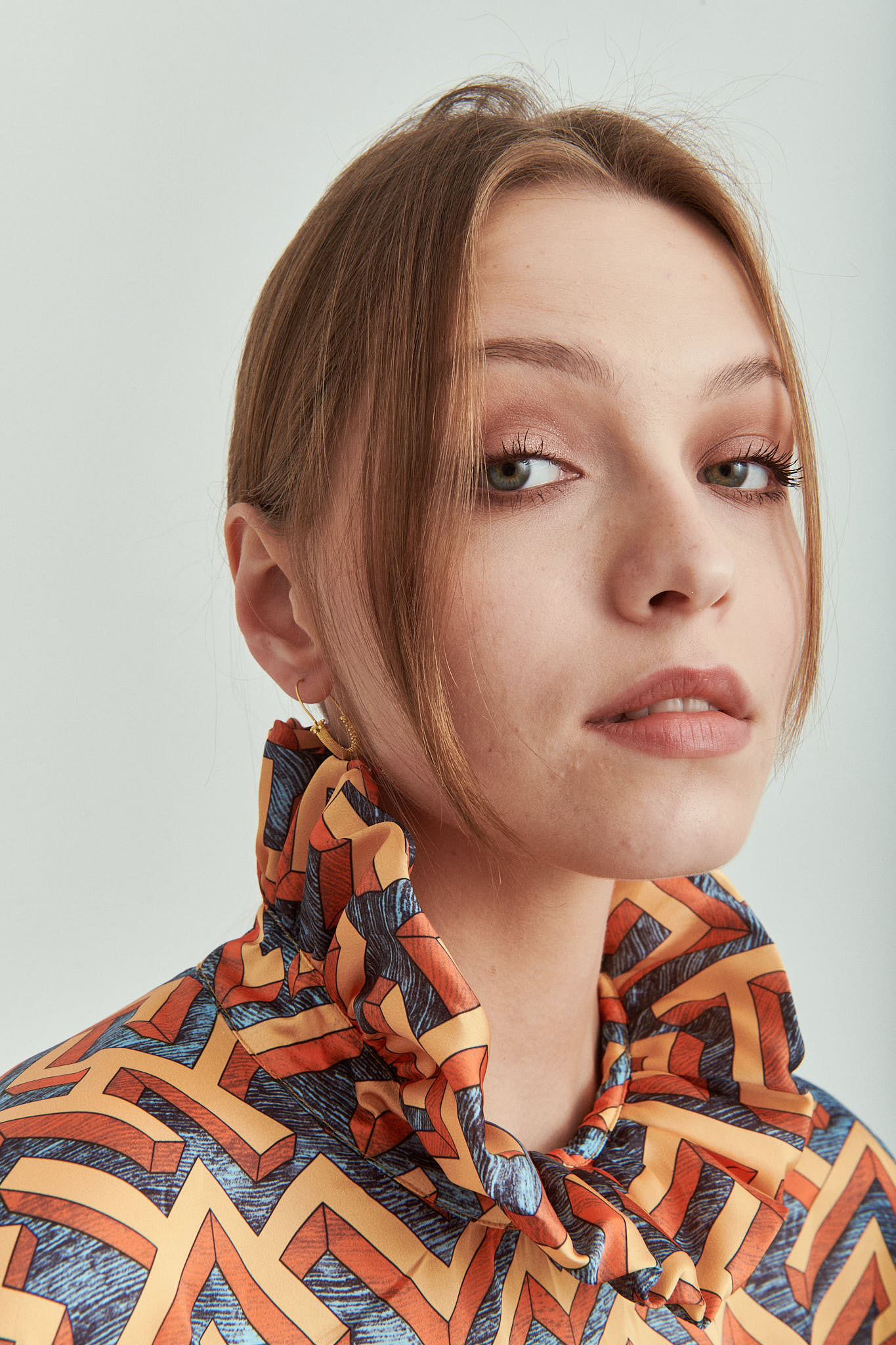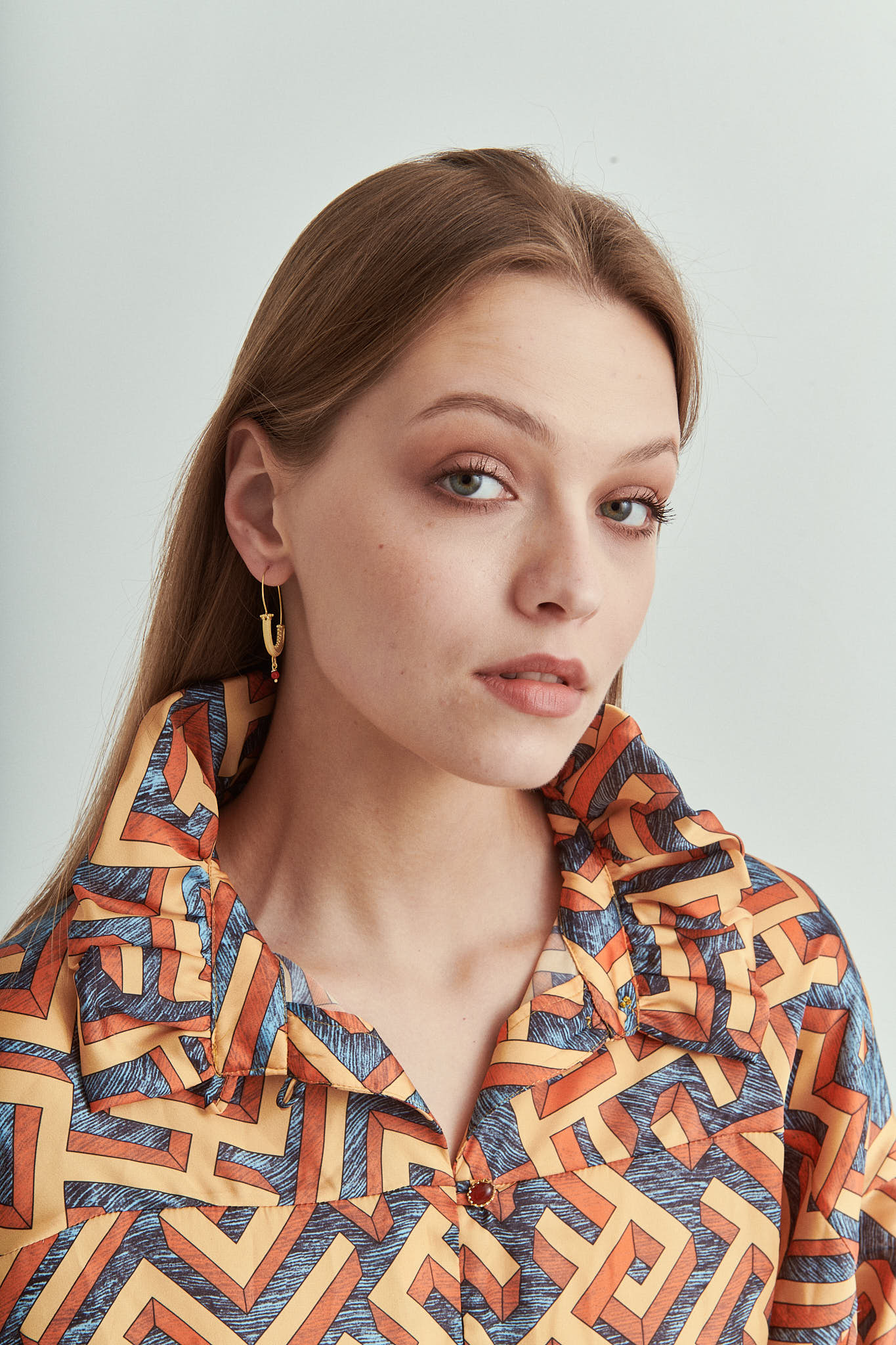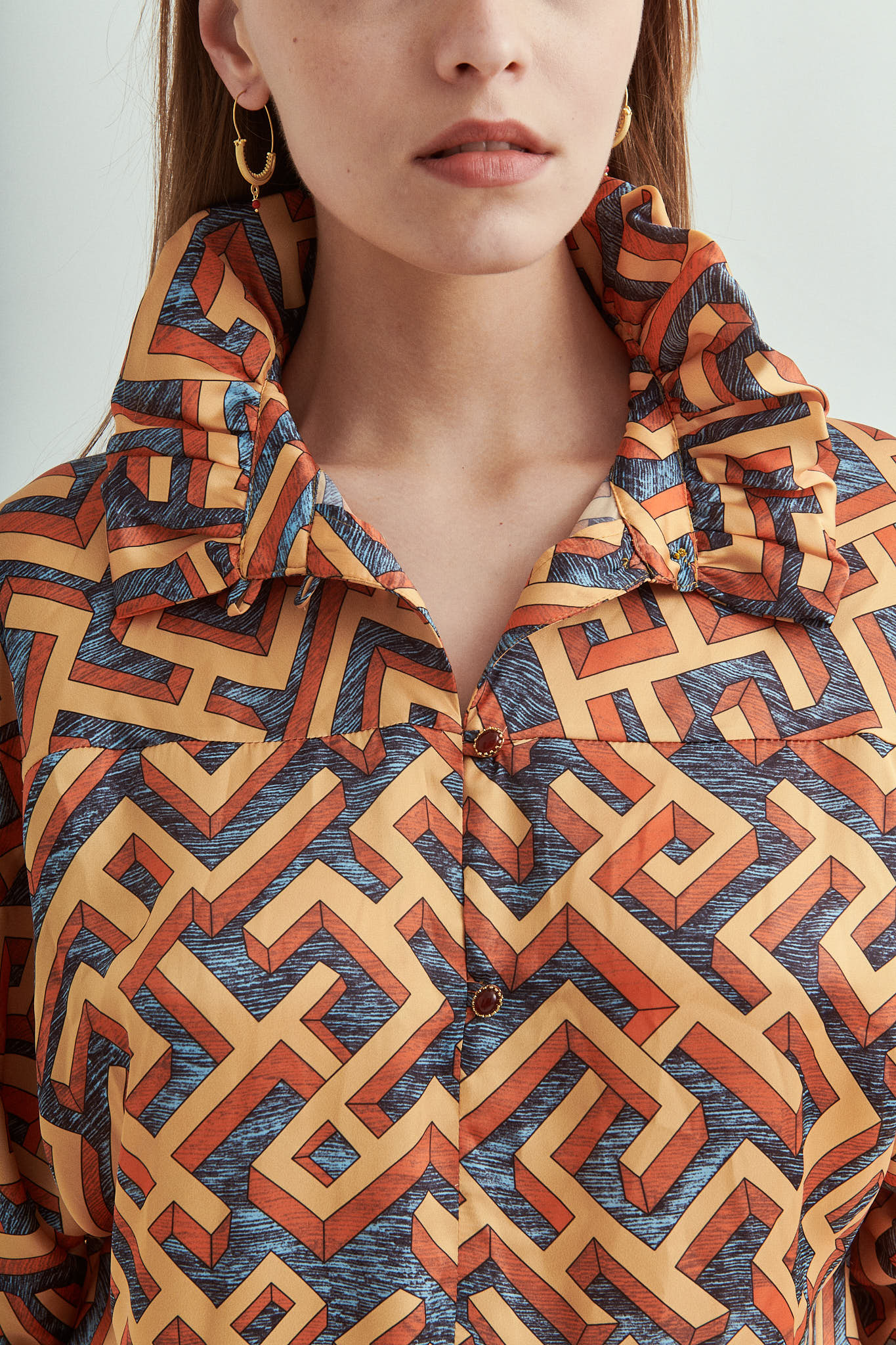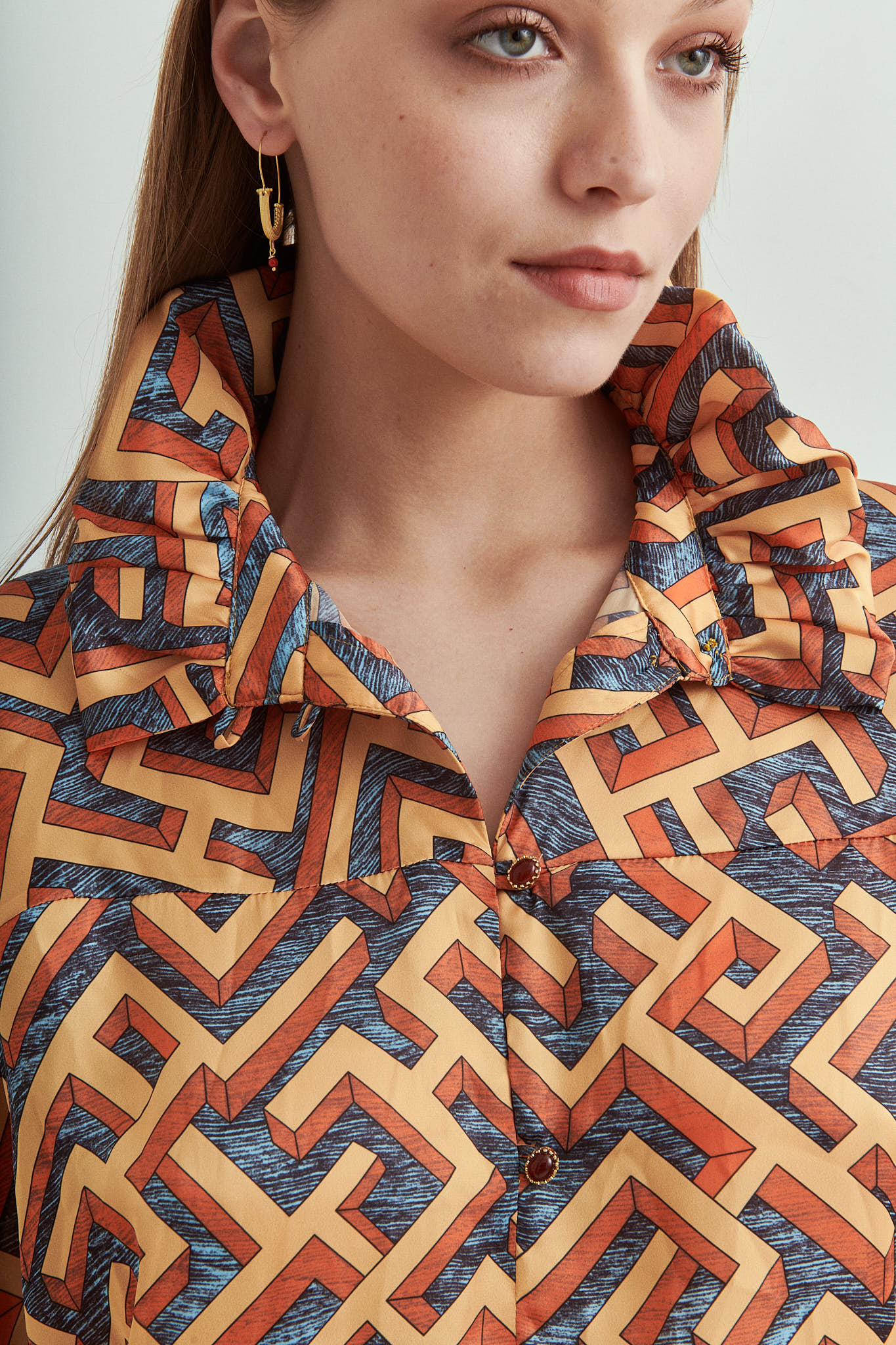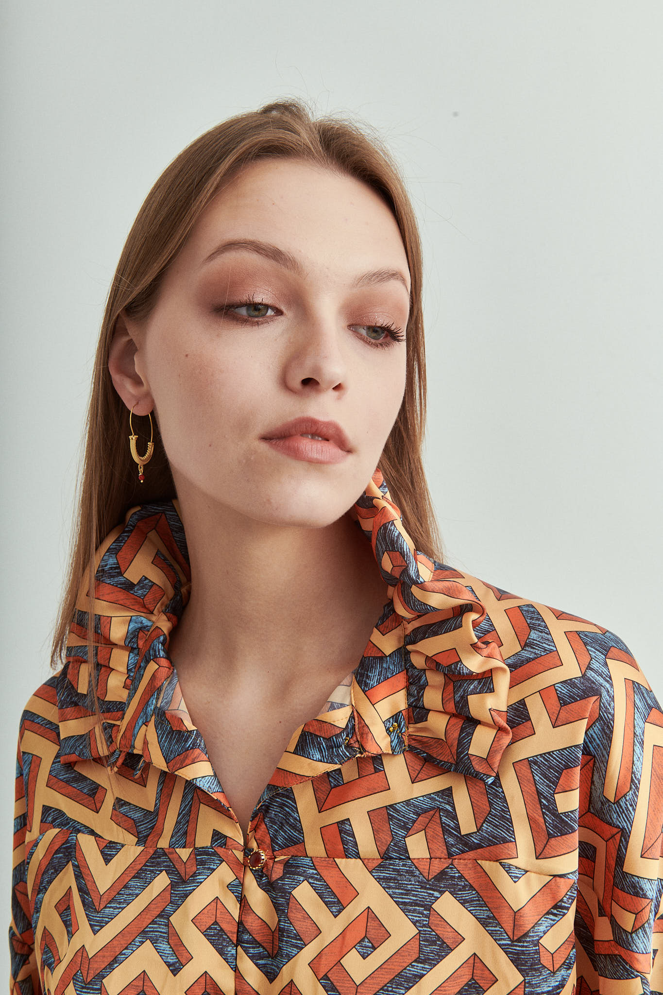 The Iris dress has two completely different look can be worn flipped front to back depending on the event/purpose or mood. One side with a high neck ruffle collar and the other side button down neck with 3 gorgeous gold plated jewel buttons. Both side with thigh high slits and balloon elasticated long sleeves finishes the look.